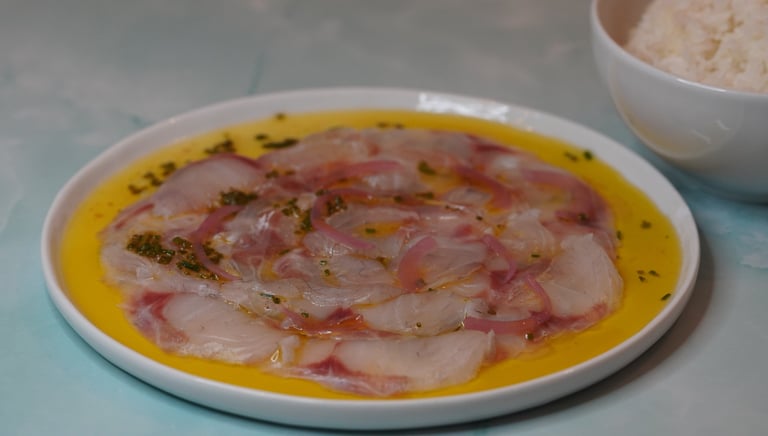 Découpez votre poisson en tranches fines et disposez-les dans l’assiette avec les oignons. Enfin, versez le reste de votre mélange d’huile sur la surface du poisson et il ne vous reste plus qu’à servir !