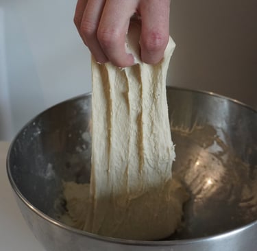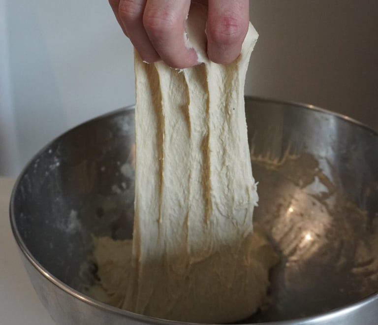 Procédez à la technique du rabat du pain (strech and fold en anglais). Pour ce faire, saisissez votre pâte et étirez-la au maximum sans la déchirer, avant de la replier sur elle-même. Tournez votre bol de 90° et répétez la manœuvre jusqu’à ce que vous ayez fait le tour de votre pâte 3 - 4 fois. Laissez reposer votre pâte une quinzaine de minutes puis répétez les rabats. Cette étape doit être faite 4 fois afin de bien développer les glutens dans votre pâte.