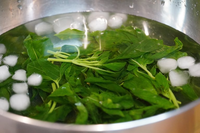 Retirez vos herbes de l’eau bouillante et plongez-les directement dans un bain de glace pour stopper la cuisson.