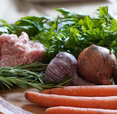 Pendant que la viande colore, préparez une mirepoix avec les oignons, les carottes et les branches de céleri (coupez tout en petits dés). Émincez également l’ail et la quantité de piment que vous souhaitez. L’idée étant plus de donner de la saveur au plat que de le relever.