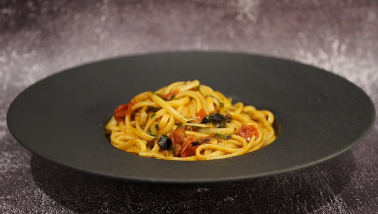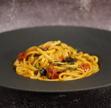 Dans une poêle, faites revenir l’ail, le piment et les anchois avec de l’huile d’olive. Après quelques minutes, ajoutez les olives et les câpres, puis les tomates.